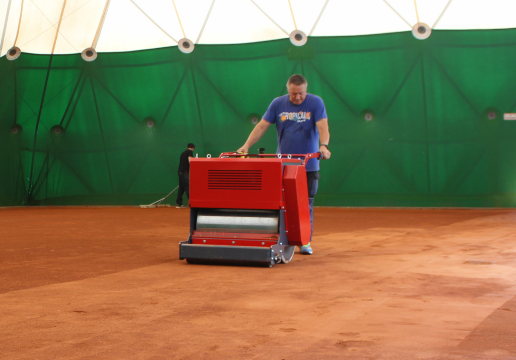 For the maintenance work needed on a clay tennis court, manual rollers are often used, but this costs a lot of time and effort.